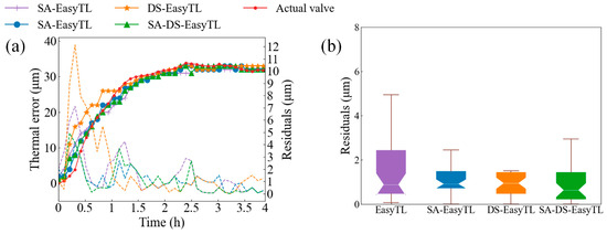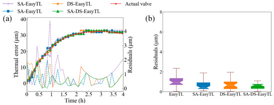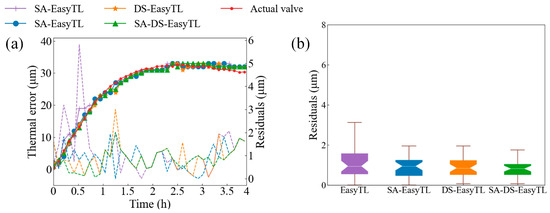 With 2000 rpm as the source domain, the prediction results of the four EasyTL improvement models for variable speed 2 are shown in Figure 16. The mean error values of EasyTL, SA-EasyTL, DS-EasyTL, and SA-DS-EasyTL are 2.513 μm, 1.829 μm, 1.161 μm, and 1.582 μm, respectively. Compared to 11.051 μm2 of EasyTL, 5.013 μm2 of SA-EasyTL, and 2.058 μm2 of DS-EasyTL, the MSE of SA-DS-EasyTL is 5.624 μm2. When the residuals account for more than 20% of the thermal error, it can be assumed that the difference between the source and target domains is too large to effectively accomplish knowledge transfer. When the source domain is 2000 rpm and the target domain is 2000 rpm, the residual difference accounts for 7.34% of the thermal error. When the source domain is 2000 rpm and the target domain is 4000 rpm, the residual difference accounts for 18.75% of the thermal error. When the source domain is 2000 rpm and the target domain is variable speed, the residual accounts for 39.3% of the thermal error. When the source domain is 4000 rpm and the target domain is variable speed, the residual accounts for 25.8% of the thermal error. The difference between the source and target domains is too large, which leads to poor model migration, so the proposed method is more suitable for knowledge transfer between fixed speeds.
