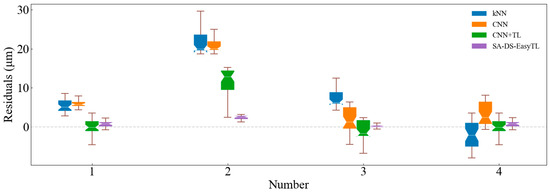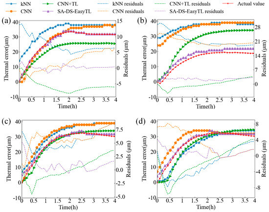 Table 2 shows the training time of each model. The training time of the CNN with spatial alignment using DS for transfer learning (CNN+TL) is reduced by 48%, which proves that the in-domain alignment method can greatly improve the training efficiency of the model. kNN has the shortest training time because it is traditional machine learning. However, compared to the CNN and the CNN with transfer learning, SA-DS-EasyTL is only 10.335 s, with guaranteed prediction accuracy. From the prediction curves in Figure 17, SA-DS-EasyTL significantly outperforms kNN, the CNN, and the CNN with transfer learning in all four experiments (Figure 18). In the first experiment, the errors of the four models were kept within 10 μm because the difference between the working conditions of the training and test dataset was not very large, and SA-DS-EasyTL slightly outperformed the other three models. In contrast, when the gap between the training and test dataset was large, i.e., when the supervised information in the source domain was used to guide the label estimation in the target domain, a larger error occurred. As shown in the second experiment, the test dataset comes from an uncooled machine tool, and the temperature of the machine tool at time 0 is higher than that in the cold state. kNN, the CNN, and the CNN with transfer learning predict the thermal error directly from the prediction models trained at 2000 rpm; thus, the thermal error predicted by the two models is much higher than the actual thermal error. SA-DS-EasyTL reduces the difference in the distributions of the source and target domains, realizing transfer learning under different operating conditions. The predicted thermal error fluctuates around the actual values with acceptable differences. In the third variable speed experiment, the thermal errors of kNN and SA-DS-EasyTL show a decreasing trend after two hours, while the CNN is not sensitive. kNN, although sensitive to the variable speed change, has the largest prediction error among the three models under variable operating conditions. Similarly, SA-DS-EasyTL likewise performed the best in the experiments from variable to constant speed. This makes knowledge transfer possible with a small number of variable speed datasets. CNNs do not perform well with fewer samples as they require a large dataset to learn the relevant knowledge.