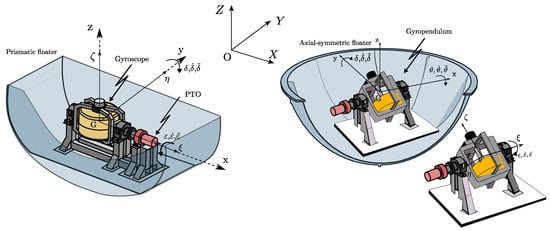 The floater is not directly involved in the energy conversion process, but it is the main component that transfers wave energy to the inner inertial system. Therefore, the wave–hull interaction dynamics must be modeled through a suitable mathematical framework. Modeling of the IRM system includes fluid–structure interactions and the characterization of mechanical coupling matrices. As discussed previously within this section, the floater’s motion is the prime mover for the gyropendulum, which reacts by means of the external forces that affect the floater’s dynamics. This interaction is crucial for the energy extraction process.