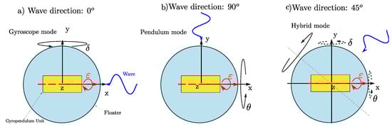 - Wave direction : The floater rotates at an angle relative to the y-axis, activating the pendulum system with the flywheel rotating at a constant speed . In this configuration, the gyropendulum is excited only by gyroscopic forces.