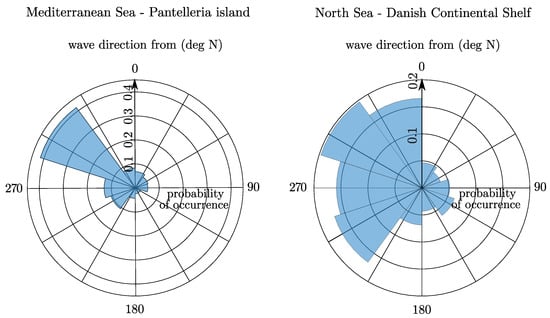 Wave roses of the two referenced installation site: the Mediterranean Sea (left) and the North Sea (right).