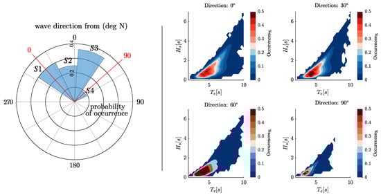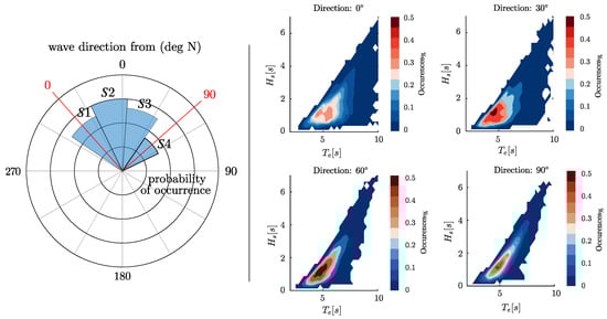 Diagram of the wave clustering according to the direction (left) and occurrence (right) scatter diagrams for the reference site in the North Sea, in the Danish Continental Shelf.