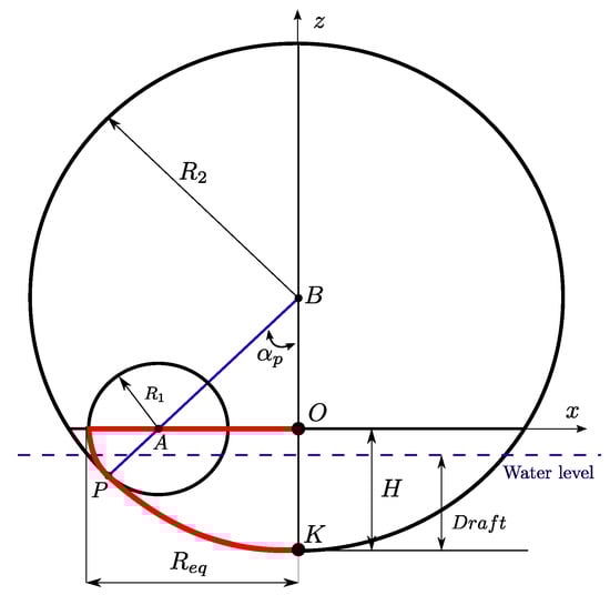 where is the derivative of the floater’s pose, coinciding with its velocity vector in planar motion. defines the uncontrollable wave excitation force [32], is the gyropendulum reaction force, and is the radiation force. The generalized mass matrix of the hull, , is referred to the frame. The hydrostatic restoring force, , is proportional to the pose of the floater and can be written as , where is the hydrostatic stiffness matrix. The radiation force is modeled using Cummins’ equation [33]. The radiation force on the i-th degree-of-freedom is defined as: