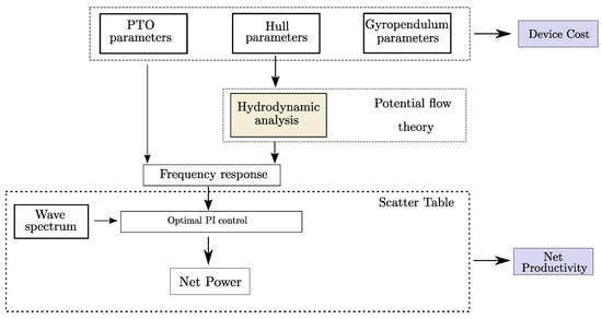 where and represent the corresponding insertion (let ; the insertion of an element in is simply ) of the matrices and in , respectively. Analogously, , and correspond to the insertion of the hydrostatic, wave excitation and radiation force vectors in , respectively. It is important to note that, given the inertial nature of the system, the equation of motion is influenced by both hydrodynamic forces and the forces arising from the mechanical coupling between the inertial mass and the floater. Further details on Equation (7) are generally provided for wave energy systems and specifically for inertial systems in [21,34].