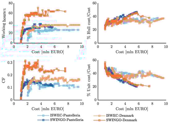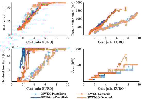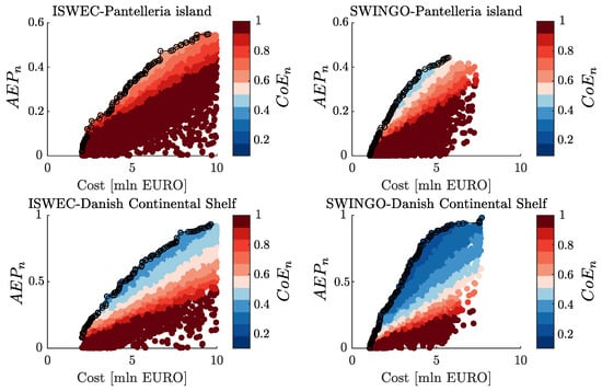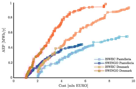 To be precise, within this paper, a techno-economic optimization of the SWINGO system is fully developed and explored, considering a comprehensive design space with high dimensionality, encompassing up to 12 design variables, including the shape and dimensions of the floater, ballast and inertial properties, gyropendulum properties, PTO rated torque, velocity and power, and gearbox speed conversion ratio. Moreover, realistic geometrical, technical, and structural constraints are implemented based on sub-component characteristics. The objective function is defined by minimizing capital cost and maximizing the Annual Energy Productivity (AEP). This expanded approach allows for a more comprehensive optimization of the WEC technology, taking into account both performance and economic factors. To evaluate this feature, the system’s performance is tested and compared across two different installation sites with distinct wave direction characteristics: Pantelleria island in the Mediterranean Sea, where waves predominantly come from a single direction throughout the year, and the North Sea on the Danish continental shelf, where wave directions are more diverse and variable.