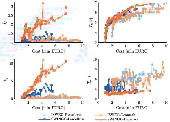 where represents the design parameters in the design space, , is the cost/performance function, which, in general, cannot be expressed in an explicit algebraic form, but can be numerically computed. Note that determines the dimension of the optimization variable, and denotes the number of objectives. Moreover, and represent a set of equality and inequality constraints, often related to the dynamical equation describing the WEC motion, and parameter bounds and any physical limitation to be guaranteed for safety of operation, respectively. In particular, the optimization process for WEC systems aims to address the following points: