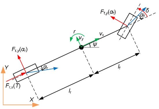 In this section, vehicle dynamics and the characteristics of the tires are described in detail to facilitate the simulation and the formulation of control strategies. As depicted in Figure 1, a simplified bicycle model for vehicle dynamics comprising five system states was established, which was achieved by aggregating the two front and two rear wheels at the geometric center of their respective axles. This model primarily considers lateral and yaw movements, with the assumption that the velocity in the longitudinal direction remains unchanged. The model utilized was formulated based on the following hypotheses: (i) the vehicle travels on a uniformly flat surface, (ii) the Ackermann steering relation is ignored and the difference in wheel angles between the left and right sides is not taken into account, (iii) the load transfer due to pitching and compliance of the suspension can be negligible. The resulting model was characterized by a set of differential equations, which are formulated as follows: