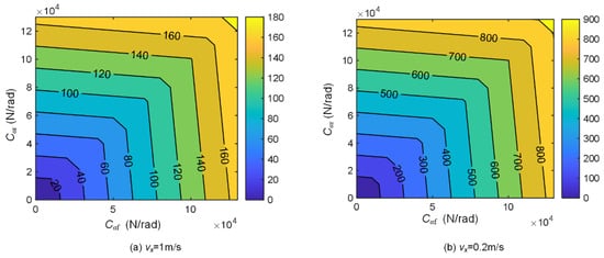 Further analysis of Equation (16) indicates that the eigenvalues are correlated with the vehicle’s speed and the cornering stiffness of the tires. The eigenvalues, as indicated by their relationship, increase with lower vehicle speeds and higher tire stiffnesses. Figure 2 illustrates the spectral Radii of the vehicle dynamics model at a vehicle speed of 1 m/s and 0.2 m/s, indicating the maximum eigenvalue magnitude of the Jacobian matrix associated with the state equation. This spectral radius is an indication of change rates for the corresponding system states, which confers a stiff nature upon the system.