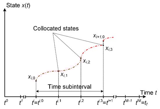 where, ; represents the Lagrange basis polynomial. The set consists of orthogonal collocation points, with being the initial point. The state vector is defined at the collocation point within the i-th time subinterval. Here, ranges from 0 to and ranges from 1 to NTE.