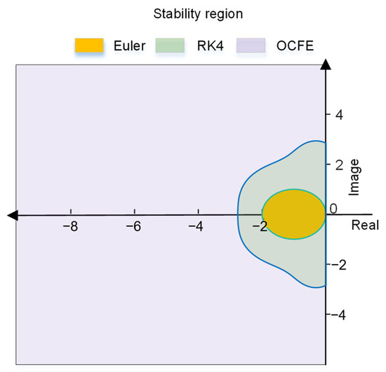 Substituting Equation (25) into (12) to satisfy the stability condition, the stable region for orthogonal collocation method is illustrated in Figure 4, alongside the stability regions for the explicit Euler method and the fourth-order Runge–Kutta (RK4) method. The x-y plane in the figure represents the complex plane of variable z.