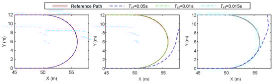 It can be seen from the figure that when the discrete time step is large (), the controller Euler-T1 based on the forward Euler discrete method fails to completely track the given reference trajectory. Upon entering the turning part, the Euler-T1 controller struggles due to the problem of low-speed integral stability. Specifically, the state variations of the vehicle’s lateral and yaw speed of the vehicle characterized by large integral stiffness are ignored under large discrete time steps, leading to an inability to effectively manage the vehicle’s steering. Consequently, the tracking error accumulates, ultimately resulting in a complete divergence from the reference trajectory. In contrast, when the discrete time step is reduced to , the Euler-T2 controller demonstrates the capacity to guide the vehicle in accurately following the reference trajectory. This simulation-based validation further verified the theoretical discrete stability analysis detailed in Section 3. Specifically, under the predefined vehicle parameter conditions, a vehicle speed of 1 m/s requires a discrete time step of 0.01 s or smaller to guarantee the discrete stability when employing the Euler discretization method.