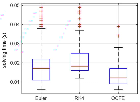 As illustrated in the Figure 6, the OCFE-T1 controller demonstrates a significant reduction in calculation, which is attributed to the increase in the discretization step length. The average computation time for the OCFE-T1 controller is recorded at 0.013 s, marking a reduction of 23.5% and 35% relative to the Euler-T2 controller’s 0.017 s and the RK4-T3 controller’s 0.02 s, respectively. This enhancement in computation time consequently bolsters the real-time performance.