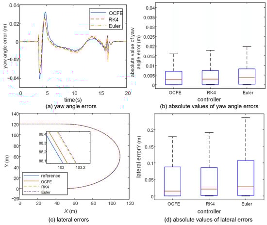 The preceding analysis in Section 3 indicates that vehicle dynamics model equations transition to a non-stiff form with the increase in the vehicle’s longitudinal driving speed. Consequently, the constraints on the discrete-time step inherent in traditional discrete-time methods within the NMPC solution process are alleviated. In this condition, Figure 7 presents the simulation results for the OCFE, RK4, and Euler controllers. As depicted in the figure, under the condition of a discrete time step of , all three controllers are capable of successfully executing the tracking task for the reference U-shaped trajectory.