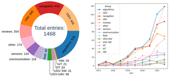 A bibliographic database was collected using the following search engines: Scopus by Elsevier [12], Google Scholar [13], arXiv [14], IEEE Xplore [15], PubMed [16], Science.gov [17], ScienceDirect [18], Semantic Scholar [19], and WorldWideScience [20]. The research queries used were: “UGV” AND “agriculture”; “algorithm” AND “agriculture” AND “UGV”; “deep learning” AND “agriculture” AND “UGV”; “artificial intelligence” AND “agriculture” AND “UGV”; “digital twin” AND “agriculture” AND “UGV”; “software” AND “agriculture” AND “UGV”; “ROS” AND “agriculture” AND “UGV”; “operating systems” AND “agriculture” AND “UGV”; “simulation” AND “environment” AND “agriculture” AND “UGV”; “embedded” AND “system” AND “agriculture” AND “UGV”. After removing duplicates and outliers, further selection was conducted based on the following criteria: (i) only articles/reviews from scientific journals, book chapters, conference proceedings, electronic preprints available in open-access repositories such as arXiv, and technical web pages (including those from sensors/hardware manufacturers); (ii) English language only; (iii) open access only, with very few unavoidable exceptions; (iv) only resources from recent years (approximately the last decade; see Figure 1 right), with very few unavoidable exceptions. This resulted in a gross list of more than 1400 resources: the BibTeX version of the list is available upon request. Figure 1 displays some features of the dataset.