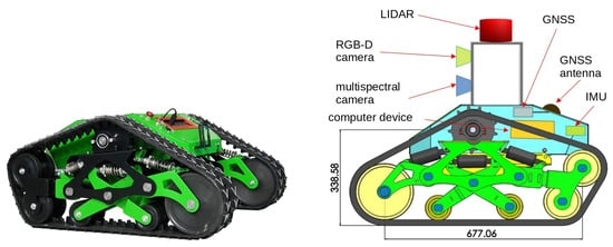 On the left: a typical robot development platform for agricultural monitoring. On the right: a simplified diagram of the main monitoring and navigation components (dimensions are in mm). Sensors are typically mounted on an external frame atop the UGV, offering a ‘human-like’ perspective and easy access to the devices. In many cases, two or more cameras are installed, facing the left and right crops. The actual number and placement of devices on the UGV may vary; the diagram is for conceptual purposes only. The image and diagram (modified by the authors) were taken from [24] with preliminary authorization.