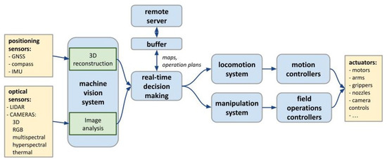 Dataflow architecture of UGVs for agricultural monitoring. The boxes on the right (‘Field Operations Controllers’ and ‘Actuators’) represent the potential integration of field treatment functionalities, an aspect that is beyond the scope of this review.