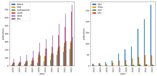 Prevalence and distribution of hardware ICT components for monitoring UGVs. This study examines the number of scientific publications from the last 10 years, as investigated using Google Scholar. On the left: sensors. On the right: computational devices (CPUs are ubiquitous and therefore are not included in the statistics).