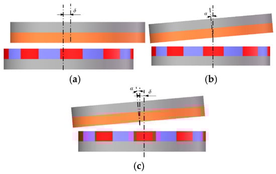 - Radial misalignment, as shown in Figure 3a: when the axis of the PM disk is parallel to that of the slotted CS, and there is a deviation distance between the two axes, which causes the decrease of the positive area of slotted CS disk, the main magnetic flux decreases but the leakage magnetic flux increases, so the magnetic-field-line-cutting range is decreased, and the torque of the SAMC is also decreased.