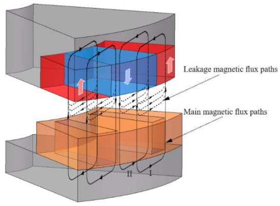 In order to change the output speed and torque, the length of the air gap between the PM disk and the slotted CS is adjusted, which introduces axial misalignment is neglected here. The misalignment of SAMC can be categorized into three types (shown in Figure 3): radial misalignment δ, angle misalignment α, and synthetic misalignment δ, α. Because the torque is dependent on the magnetic field intensity, when the influence of three misalignment forms on the output torque is discussed, the possible misalignment of the magnetic flux paths of the SAMC needs to be analyzed. Figure 4 shows the magnetic flux paths of one pole pair during complete alignment, wherein, the magnetic flux path I is the main flux path (shown as a solid line) and leakage magnetic flux path (shown as a dotted line) is distributed vertically through the copper conductor along the axis, respectively. In addition, the magnetic flux paths I and II also show the distributions of two different positions of the main magnetic flux path and leakage magnetic flux path along the radius direction. When there is the misalignment of the SAMC, both the main magnetic flux and the leakage magnetic flux may increase or decrease according to the three misalignment cases as follows: