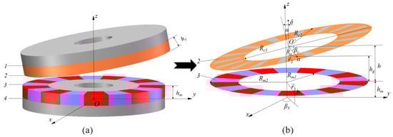 Figure 5a is the 3D model of SAMC when synthetic misalignment. In order to analyze the transmission characteristics of the SAMC, a three-dimensional cartesian coordinate system is set on the bottom surface of the PMs, and the center O of the bottom surface is set as the origin of the system. Let the upper surface of the slotted CS be 1, the bottom surface 2, the upper surface of the PM disk 3, and the bottom surface 4. As shown in Figure 5b, surface 2 is inclined to surface 3 at an angle α, and the center O’ of surface 2 is offset to the z-axis at a given distance δ. In order to facilitate the observation of each set of parameters, surface 2 and surface 3 are taken out separately, and a model diagram is established, shown in Figure 5b.