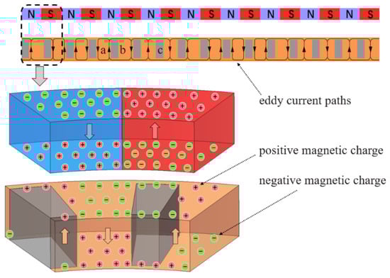 Figure 6 is the magnetic charge distribution and eddy current distribution of one pair of poles when the relative position angle of the PM disk and the slotted CS φ is 0. According to the theory of the magnetic equivalent charge, the arrow of the magnetization direction of the PM is equivalent to the positive magnetic charge, and the other end of magnetization direction is equivalent to the negative magnetic charge. Therefore, the magnetic charge on the sides of the N pole is opposite to that on the sides of the S pole. In order to express the distribution of magnetic charge on the slotted CS in the SAMC, the induced magnetic field generated by the copper conductor is equivalent to an induction magnet, and the north and south magnetic poles of the induction magnet correspond to positive and negative magnetic charges, respectively (see Figure 6). Therefore, the force between the PM disk and the slotted CS is produced because of the interaction between the magnetic charge distributed on surfaces 1 and 2 of the equivalent PMs and the magnetic charge distributed on the surfaces 3 and 4 of the PMs. The opposite magnetic charge toward each other between the PMs and CS produces the attraction, while the same magnetic charge toward each other produces the repulsive force.