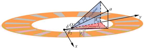 Figure 7 shows the geometric relationship after the projection of the slotted CS on the x–y plane when there is synthetic misalignment; according to the trigonometric function relationship the distance r2 is expressed as