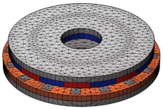The basic structure and physical parameters of the SAMC studied in this section are the same as those described in Table 1 and Figure 1, which mainly include PM disk yoke iron, PM, slotted CS, and slotted CS yoke iron. The prototype is made using fan-shaped NdFeB magnets, pure copper plates, and industrial pure iron (DT4) plates. Figure 8 shows the FEM model of SAMC. Simulation software is used to generate a sufficiently thin grid by using a fixed computational grid method, so that the conductor layer can maintain numerical stability.