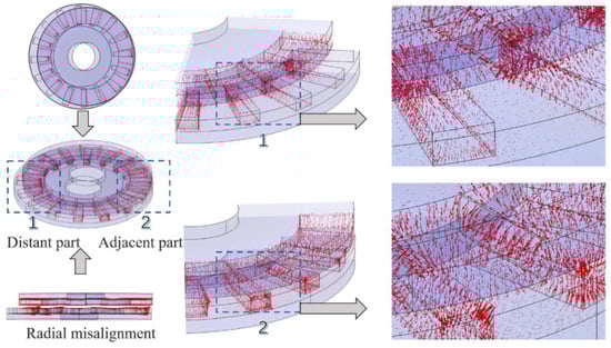 Figure 10 shows the distribution of magnetic field lines inside the SAMC in the case of radial misalignment, and it can be seen that the PM disk deviates from the distant part of the slotted copper CS, compared with Figure 9, the density of magnetic field line of force inside the slotted copper CS, which is not directly aligned with PM disk decreases significantly. That is, the leakage magnetic flux path in this part increased, which was consistent with the prediction.