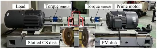 Figure 13 shows the experimental measurement platform, including a prime motor, two torque sensors, and a load motor, which is used to provide load. The prime motor is connected to the torque sensor, and then the SAMC is installed on the active end, and both the PM disk and the slotted CS disk can be used as the active end. In this experiment, the prime motor and the PM disk are used as the active end, and the slotted CS disk is connected to the torque sensor and then connected to the load to form the driven end. The input speed is 1200 rpm, and the air gap length and the output speed are controlled to obtain different output torque ratings. At the same time, a set of experiments is repeated several times to ensure the accuracy of the data. In addition, the performance of the PMs is affected by the high temperature, if the eddy current in the conductor disk is too large; as a result, the test is performed at low slip speeds.
