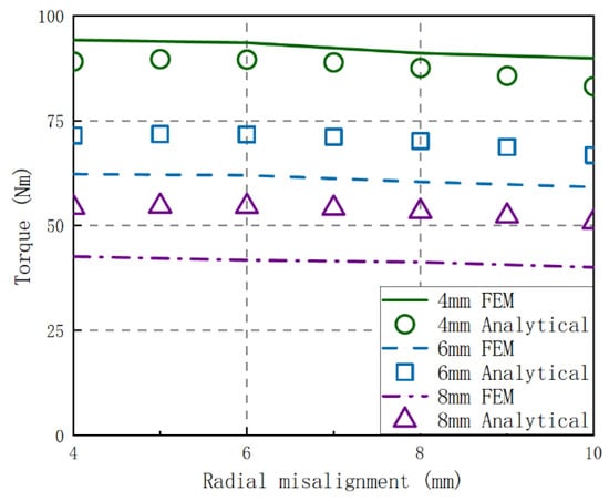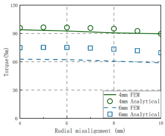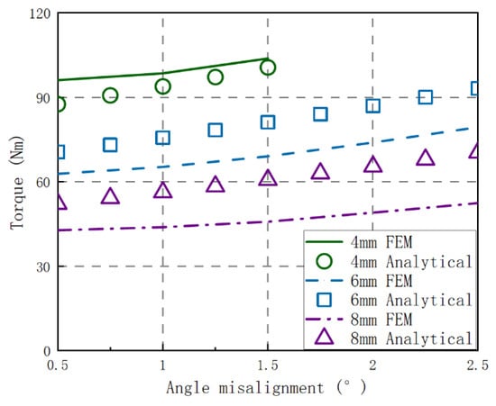 In order to verify the applicability of the model proposed in this paper, the torque sizes of different radial and angle misalignments under different air gaps calculated by the theoretical method are compared with those simulated by the FEM. The results are shown in Figure 14 and Figure 15.