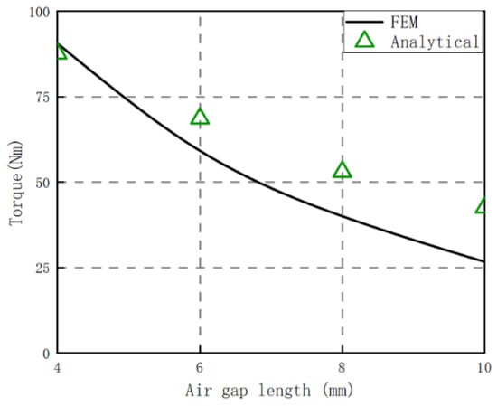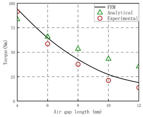 Figure 17 shows the relationship between torque and air gap length obtained by theoretical calculation when α = 0°, δ = 0 mm, compared with FEM results and experimental results. It can be seen that when the length of the air gap increases, the deviation of the theoretical calculation results will be larger; when h = 6 mm, the error is 10.98%. This is still because the main magnetic flux will gradually bend and decrease under a larger air gap thickness, and the magnetic leakage will increase, resulting in a larger induced magnetic flux calculation and thus a larger torque value.