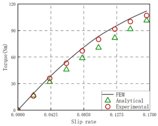 The slip rate is the important index for SAMC, and the slip rate has a significant impact on both eddy current density and torque characteristics, so the influence of the slip rate on the torque is studied. Figure 19 shows the relation between torque and slip rate under the α = 0°, δ = 0 mm, when air gap length h = 4 mm. From Figure 19, the torque obtained by the theoretical calculation, simulation, and experimental have good consistency under low slip rate; when the slip rate is 0.104, the error is 11.66%.