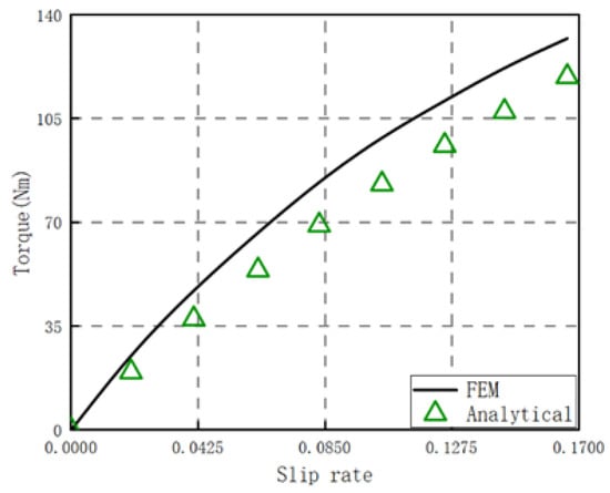 Figure 20 shows the relation between torque and slip rate under the synthetic misalignment of α = 0.5°, δ = 4 mm, when h = 4 mm. From Figure 20, torque figures obtained by the theoretical calculation and simulation also have good consistency under low slip rate; when the slip rate is 0.0625, the error is 18.9%. But because the SAMC usually works at low slip rate to reduce eddy current loss, this method proposed can also be used to calculate torque in misalignment.