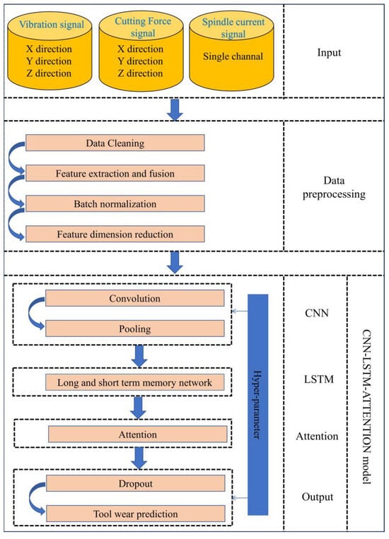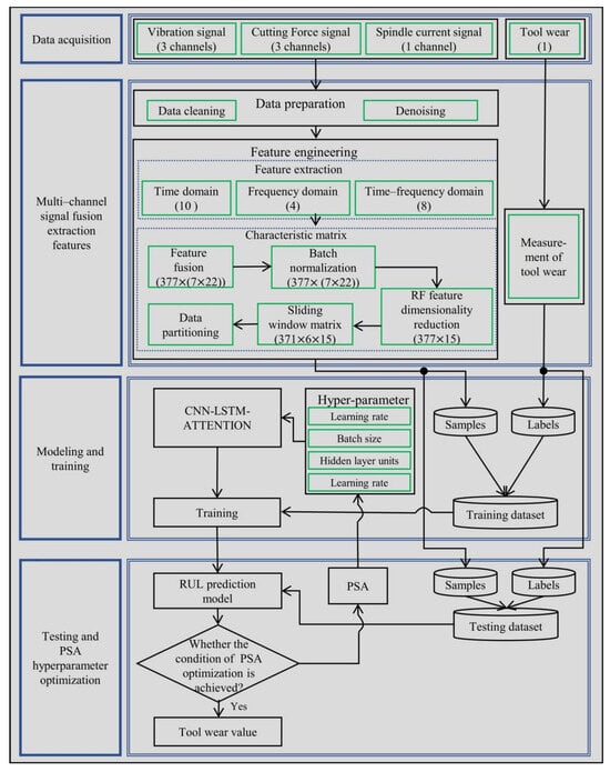 On the foundation of the original CNN-LSTM model, this study employed the attention mechanism to strengthen the model’s capability to capture key information within a time series. Moreover, by integrating the PSA algorithm for hyperparameter optimization, the study not only enhanced the prediction accuracy but also boosted the model’s adaptability to tool wear characteristics across various conditions.