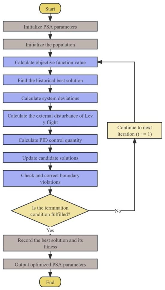 The optimization flowchart for the PSA algorithm is shown in Figure 2.