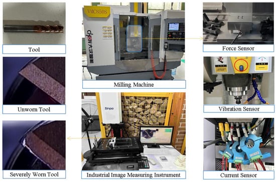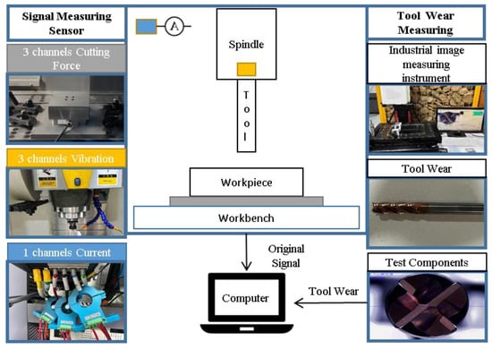 The method of raw data acquisition is shown in Figure 4. The three-dimensional force sensor is installed on the workbench, the vibration sensor is installed on the spindle, and the current sensor is installed on the three-phase leads of the spindle motor within the milling machine’s control cabinet. Through the installation and acquisition with these three sensors, a total of seven channels of raw characteristic signals were collected. These three signals have different focuses and together form a comprehensive signal system to predict the RUL of milling cutter. Cutting force signals provide direct mechanical information, and vibration signals capture subtle changes, while current signals serve as an indirect and cost-effective monitoring method. Machine learning models integrate these different types of signals to improve prediction accuracy and reliability, achieving effective predictions of tool RUL.
