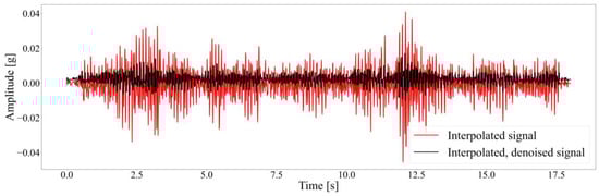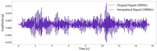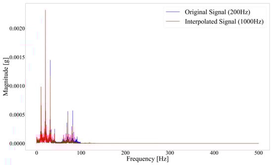 To address the varying sampling frequencies of force (1000 Hz), vibration (200 Hz), and current (100 Hz) signals, all signals were resampled to a uniform frequency of 1000 Hz. Linear interpolation was applied for both vibration and current signals to maintain data alignment and ensure that the signals were synchronized for subsequent analysis. This method minimizes the risk of aliasing and preserves the essential characteristics of the lower-frequency signals. Figure 5 and Figure 6, respectively, depict the time-domain and frequency spectrum of the original signal and the resampled signal in the x-direction of vibration. The absence of significant changes confirms the effectiveness of our resampling method. To address the issues related to sampling near the Nyquist frequency (100 Hz for the 200 Hz sampling rate), a low-pass filter was applied to the original signal before interpolation. This filter eliminates any frequency components above 100 Hz, ensuring that the resampled signal does not introduce interpolation artifacts or frequencies beyond the Nyquist limit. This approach guarantees that the dominant frequency component, which lies exactly at 100 Hz, is accurately represented without contamination from higher frequencies.