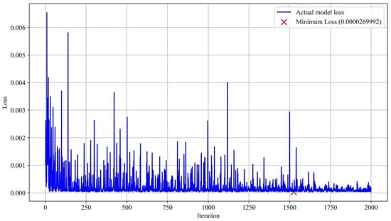 To this end, the study introduced PSA to optimize the model’s hyperparameters. In the PSA, a series of parameters were established, including a population size of 20 (N), a number of variables of 4 (nvars), a number of iterations of 100 (T). According to the recommendations of the PSA algorithm’s proposer, in this study, ,, and were set to 1, 0.5, and 1.2, respectively. This paper defines the search space for the following hyperparameters: a learning rate ranging from 0.001 to 1, a batch size ranging from 8 to 128, a number of hidden layer units ranging from 16 to 128, and a dropout rate ranging from 0.1 to 0.5. These parameters collectively work in the PSA to guide the search process and find the optimal combination of hyperparameters. The optimization process is shown in Figure 12. Specifically, the algorithm adopts a PID control-based approach, iteratively searching and adjusting the impact of each parameter on the objective function, continually approaching the optimal solution. The model’s loss function, mean squared error (MSE), is used as the optimization objective, meaning the parameters are adjusted to minimize the value of the loss function.