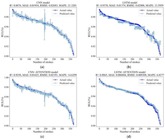 Table 3 presents a comparison of the evaluation metrics for the CNN-LSTM-Attention and CNN-LSTM-Attention-PSA models, revealing that the CNN-LSTM-Attention-PSA model outperforms in addressing the RUL prediction problem. The R2 value can reach 0.9942, indicating that the model can explain 99.42% of the variance in the sample wear amounts. The MAE and RMSE are 4.7557 × 10−3 and 6.0846 × 10−3, respectively, meaning that the model’s average error and standard deviation in predicting each sample’s wear amount are both below 0.01 mm. Finally, the MAPE value is 4.4429, indicating that the model’s average percentage error in predicting wear amounts is less than 5%. Conversely, the performance of the four manually tuned CNN-LSTM-Attention models was highly unstable, and even the best-performing set was inferior to the CNN-LSTM-Attention-PSA model.