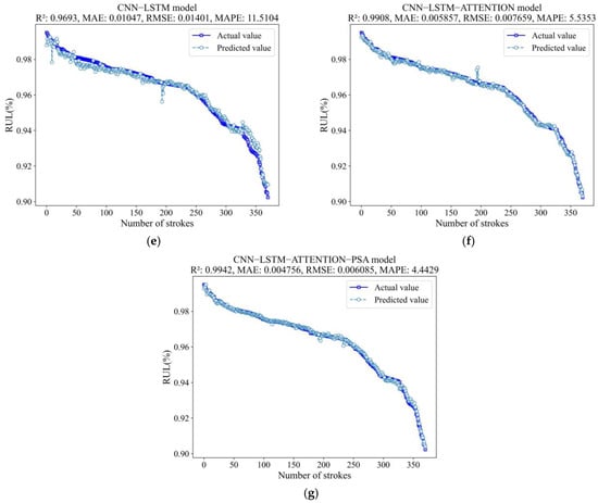 The predicted results of each model: (a) CNN model; (b) LSTM model; (c) CNN-ATTENTION model; (d) LSTM-ATTENTION model; (e) CNN-LSTM model; (f) CNN-LSTM-ATTENTION model; (g) CNN-LSTM-ATTENTION-PSA model.