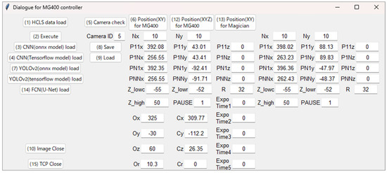 The software for robot control based on HCLS data is developed on Python, which allows users to control the robot through the dialogue application shown in Figure 1. For example, an HCLS data file is loaded by clicking “(1) HCLS data load”; an HCLS data file loaded is executed by clicking “(2) Execute”; a CNN model saved with the open neural network exchange (ONNX) format is loaded for defect detection by clicking “(3) CNN (ONNX model) load”; the availability of the camera for visual feedback control is checked by clicking “(5) Camera check”; a YOLOv2 model saved in the ONNX format is loaded for defect detection by clicking “(7) YOLOv2 (ONNX model) load”; 10 × 10 positions and the corresponding 100 GOTO statements are automatically generated by clicking “(6) Position(XY) for MG400” or “(12) Position(XYZ) for MG400” after only giving four corner positions.