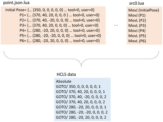 To deal with this problem, the data converter implemented by the authors can systematically generate the corresponding HCLS data file from two of seven data files, as shown in Figure 2. One is src0.lua containing interpolation instructions. The other is point.json.lua containing teaching points. Although HCLS data basically have a structure based on the CLS data generally used in CAD/CAM systems, the superiority is its extendability of function. Table 1 shows the proposed HCLS statements currently available for the MG400 manipulator. For example, each statement from SNAPSHOT to CNN_DEFECT, SNAPSHOT_DIFF, and WEIGHT_CHECK provides us unique benefits that are not supported by NC codes.