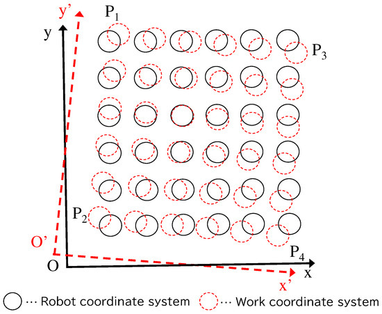 In an example of the peg-in-hole task shown in the next section, which handles many small resin-molded articles, the clearance between an article and a hole on a jig side is about 1.0 mm. Therefore, picking and placing cannot be performed normally if the robot coordinate system and work coordinate system are misaligned, as shown in Figure 4. The proposed method can deal with the problem by setting only four corner positions.