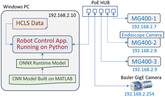 Major industrial robot manufacturers provide a variety of small-sized industrial robots. However, it is not easy for small- and medium-sized manufacturers in terms of introduction cost to introduce multiple robot systems to meet the need for the automation of segmented work processes. To cope with this problem, the authors decided to employ low-cost 4-DOF robot arms. The robot is Dobot MG400 (from now on referred to as MG400) provided by Shenzhen Yuejiang Technology Co., Ltd. (Shenzhen, China) [21]. It is equipped with a suction cup or an electromagnetic gripper as an end-effector. This robot has only 4-DOFs, less than the 6-DOFs generally required for industrial robots. However, this is not a problem when the robot is used only for tasks in which controlling the roll and pitch angles of the end-effector is not needed. In addition, the robot manufacturer provides an easy-to-use teaching interface [22], by which position data for the end-effector can be manually obtained. However, a CAD/CAM interface like for NC machine tools is not provided. Furthermore, it seems that visual feedback control for object tracking, cooperative control for multiple robots, and the CNN model for defect detection are not supported yet. The main objective of this study is to give MG400s such functionalities based on HCLS data.