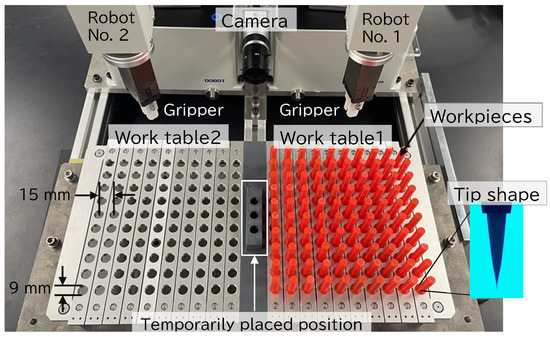 Figure 5 shows the overall configuration framework of the experimental system, in which any PLC is not needed. The endoscope camera attached to the MG400-2 is used for object detection in Figure 3. Furthermore, the Basler GigE camera is used for the defect detection experiment in Section 3. Figure 6 shows an experiment scene of a peg-in-hole task using two MG400s to evaluate the effectiveness of the proposed system, in which two MG400s named No. 1 and No. 2 are cooperatively used. One hundred prototypes of cylindrical resin-molded articles with the length: 44 mm, the diameter of insertion part: 8 mm, and the diameter of grasping part: 7 mm were made using a 3D printer. On the jig side, two work tables with 100 holes are prepared and named work Table 1 and Table 2. The diameter of each hole is 9 mm and the adjacent holes are located at an interval of 15 mm. In addition, a small jig with three holes of 9 mm diameter is placed between the two work tables, where articles are temporarily placed for a next sequence.