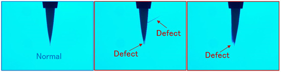 In this section, an advanced HCLS data statement coded as CNN_DEFECT is introduced to call a CNN model for defect detection of an industrial product. One of promising applications by industrial manipulators is for a robotic peg-in-hole task while checking undesirable defects. Figure 7 shows typical defects seen in the actual production line of this product. These types of defects tend to appear around the tip during the manufacturing process. Due to the statement of CNN_DEFECT, it is expected that undesirable defects around the tips of workpieces can be detected and sorted by the robots.