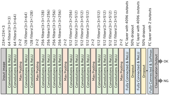 Figure 8 shows the CNN model consisting of 47 layers for binary classification, i.e., OK or NG, built by the VGG19-based transfer learning method on MATLAB. The model is additionally trained using a training dataset consisting of 156 OK images and 196 NG ones. In designing the VGG19-based transfer-learning CNN model from the original VGG19 for 1000-class classification, we replace only the final fully-connected layers, the softmax layer, and the class output layer, then use the dataset for additional training to deal with the binary-class classification task. The additional training is conducted with a learning rate of 0.0001 up to the 42nd layer and with a learning rate of 0.001 from the 43rd layer to the final one in order that the powerful feature extraction capability originally acquired by the convolutional layers of VGG19 is not declined. Note that the resolution of input images has to be downsized into 224 × 224 × 3 before training and test to fit the input layer of VGG19. Other training conditions are tabulated in Table 2.