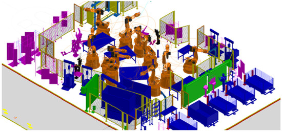 The assembly process in each of the lines begins simultaneously in two flowlines of the production line. In the first flowline, a part is loaded into St-01 by a manual process. In the second flowline, a part is loaded into St-02 by a manual process when a part enters the station. Once both parts are in position, the clamps or flanges are locked to hold the part in place, and once the part is secured, a signal is emitted to activate the work of the different robots. These robots have the task of carrying out a series of welds on the part in order to guarantee its solidity and stability. When the process ends, the part is moved along its flowline, repeating the welding operations and adding new parts or reinforcements until the final assembly is completed. The cycle times of the loading stations will always be much shorter than the cycle times of the robots. Robots R-08 and R-09 are placed in parallel because the tasks assigned to these robots are far above the other stations. This means that, although their cycle times are longer than those of the rest of the line, they both work as one robot at half the cycle time since they can produce twice as many parts in the reported cycle time.