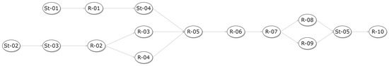 Each of the lines consists of 10 robots, whose names are defined by the acronym R and the sequential position they occupy within the line, and eight intermediate tables, named stations. The general purpose of these is to house the part while the welding process is being carried out until the final assembly of the side is completed. As is done with the robots, we will proceed to name the stations using the acronym St., including its position within the line. Figure 5 shows the flowchart of the lines.