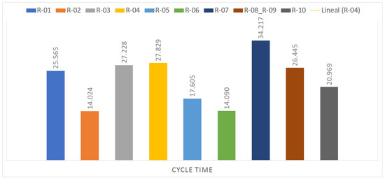As seen in Table 1, the bottlenecks detected are found between R-08 and R-09; however, these two robots work in parallel and this status would not be real. Therefore, in Table 2, a change has been carried out by joining both robots under a single column whose result is the maximum time of the two robots divided by two. After this change, we can see how R-07 is the bottleneck from the classic point of view. The cycle time has been marked in red in Table 2. Figure 6 shows a graph of the cycle times.